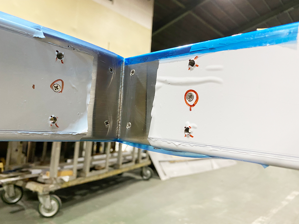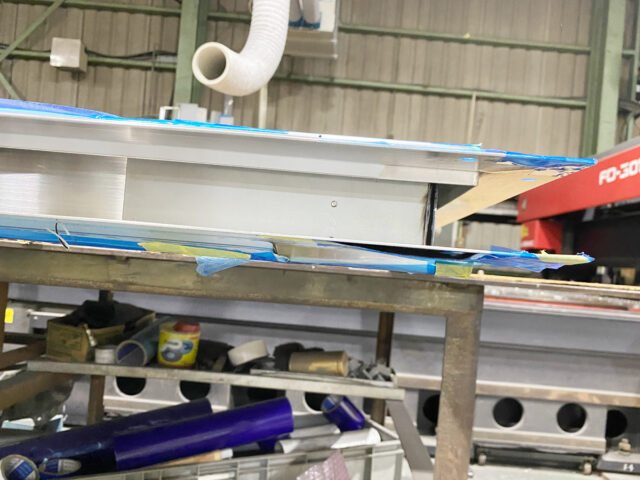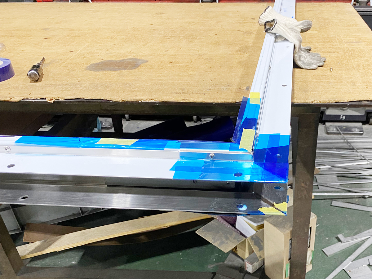 上枠と竪枠のトメの部分はフル溶接とし、焼け取り迄で、ドアを取り付ける枠と3.2㎜裏板はタップにて共に縫いつけ、裏板も枠本体に縫いつけしました。